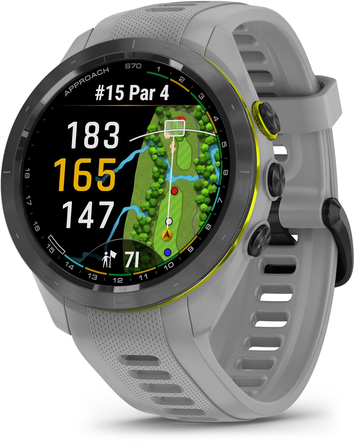 Play smarter using the Garmin Approach S70 42 mm Golf GPS Watch. Packed with tons of tools and features designed to help golfers play easier and better, this watch allows you to take your game to the next level. It's pre-loaded with 43,000+ golf courses to give you vital data, such as potential hazards, slope information and distance measurements. The watch can also give you club suggestions based on performance and wind metrics, and it can keep track and keep score as you play. In addition to golf tools, the watch also has a whole array of other health and fitness capabilities to support your overall well-being day in and day out. Water-resistant. Ceramic bezel and silicone wrist strap.