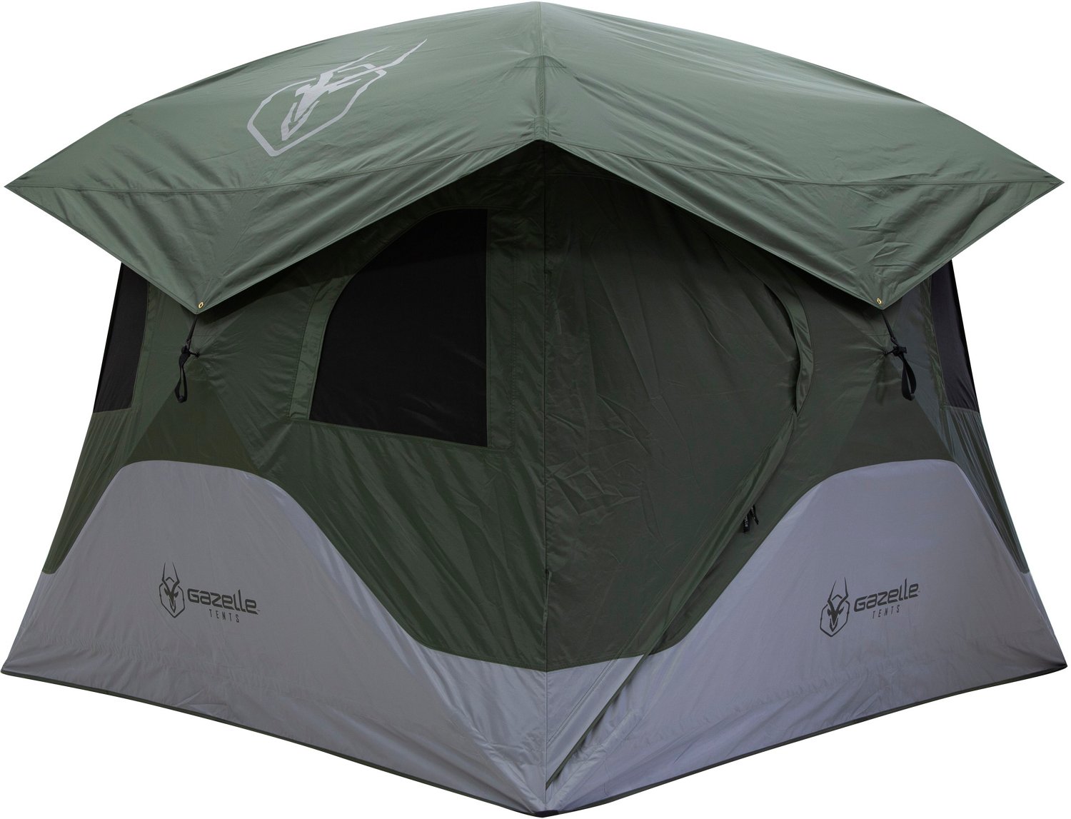 Stay warm and dry in the Gazelle T4 Portable Hub Tent. This tent features 210 denier Oxford weave polyester shell material that is waterproof up to a 2000MM HH rating to keep you dry. The oversized rain fly easily attaches to the roof panels for additional protection from the sun and rain.