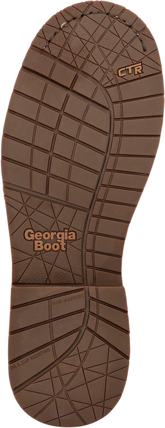 Stay on task with the Georgia Men's AMP LT Wedge Moc-Toe Work Boots. The full-grain leather uppers afford durability, while the EVA midsoles offer increased cushioning. The AMP LT memory foam insoles provide comfort, and the Carbo-Tec rubber outsoles are slip resistant for grip.
