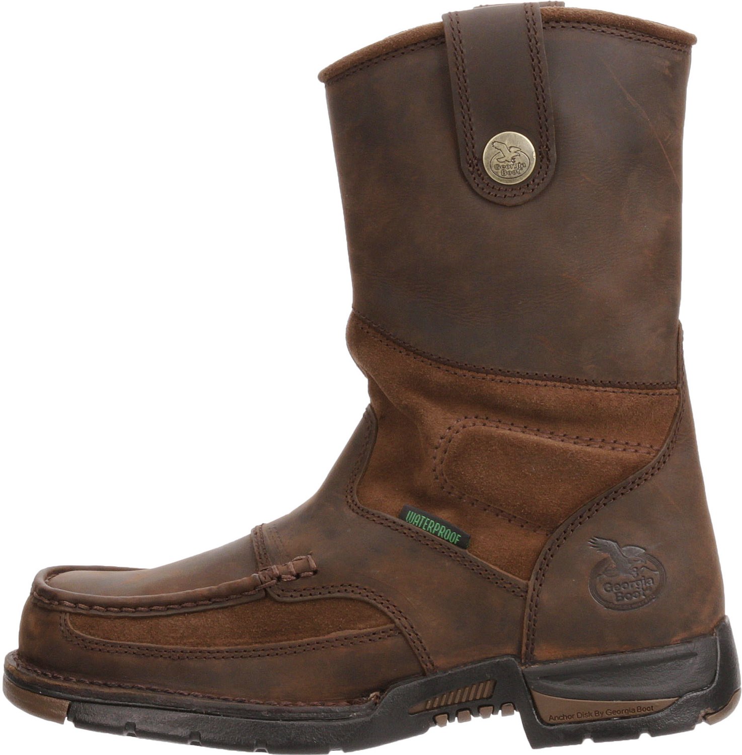 Stay dry and comfortable on the jobsite with these Georgia Men's Athens EH Wellington Work Boots, which boast a slip-resistant design for sure footing. The leather uppers with suede panels combine with the Georgia waterproof system to ensure moisture stays out while you work.