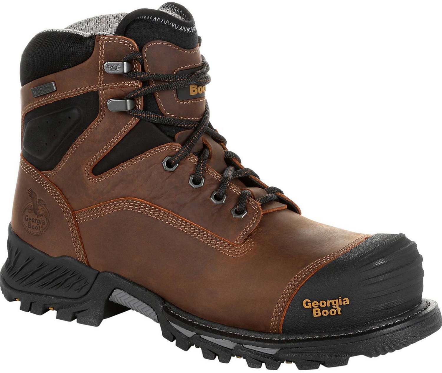 Work safe in the Georgia Men's Rumbler Waterproof CT Work Boots. They're EH rated and have composite safety toes to guard against workplace hazards. They're also fully waterproof for dry comfort and are equipped with memory foam cushioning to prevent foot fatigue throughout the day. The boots are crafted from full-grain leather to ensure long-lasting wear. Slip resistant. ASTM compliant.