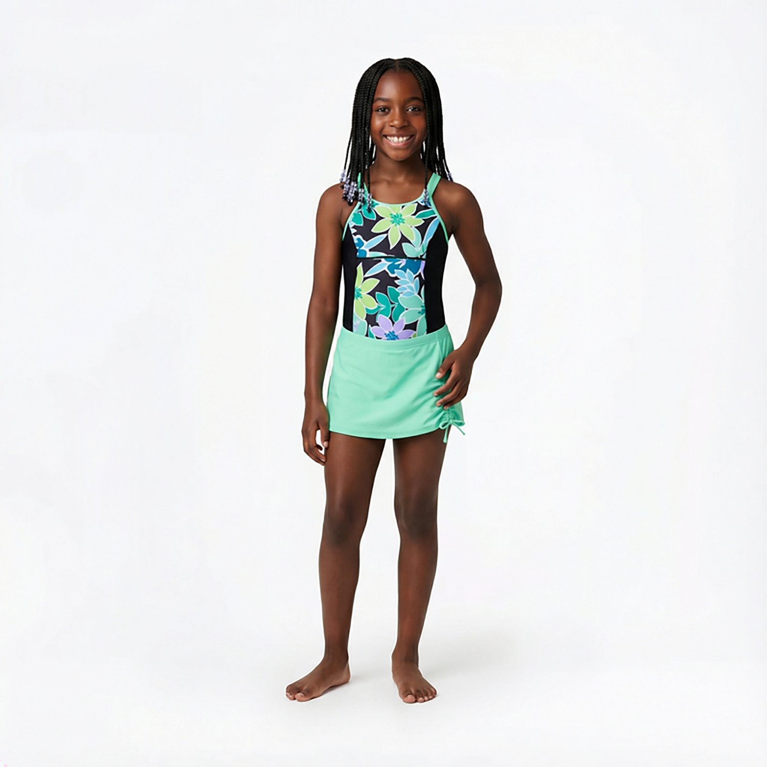 Splash around in the Gerry Girls' Lavish Double Strap 1-Piece Set. Its quick dry fabric eliminates chaffing after water activities. The natural, chemical free UPF 30+ offers sun protection, and its breathable lining enhances hygiene and reduces skin irritation. The coverup skirtini has a full elastic waistband to ensure a comfortable, adjustable fit.