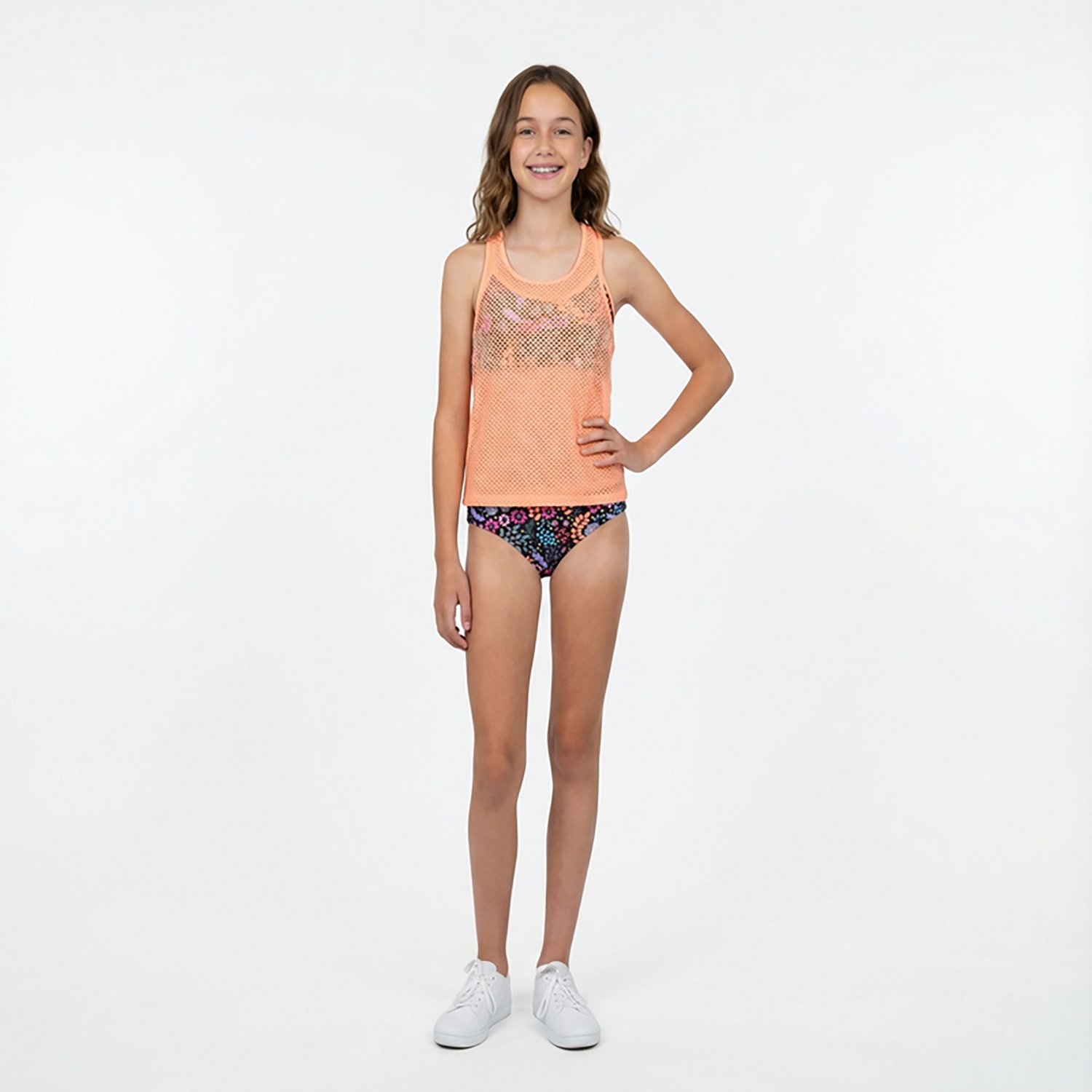 Splash around in the Gerry Girls' Terrarium Double Strap 3-Piece Bikini Swim Set. Its fabric quickly dries. The natural, chemical free UPF 30+ provides sun protection, and its briefs are fully lined. The set includes a sport top, a pair of briefs, and a coverup tank top.