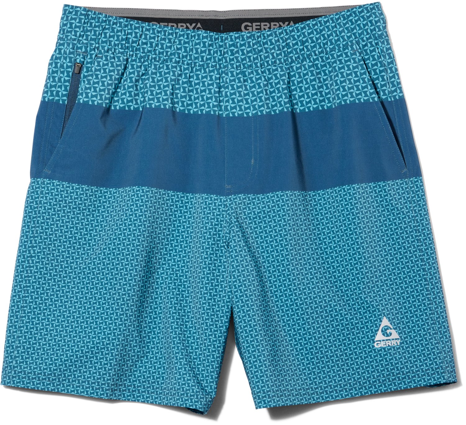 Splash around in the Gerry Men's Geo Ornament Color Block Swim Shorts 9 in. Their 4-way stretch and lightweight fabrication provides maximum mobility. The elastic waistband offers a comfortable fit, and their closure has a 1/4 zip. The reflective silver GERRY logo is screen printed on the leg opening.