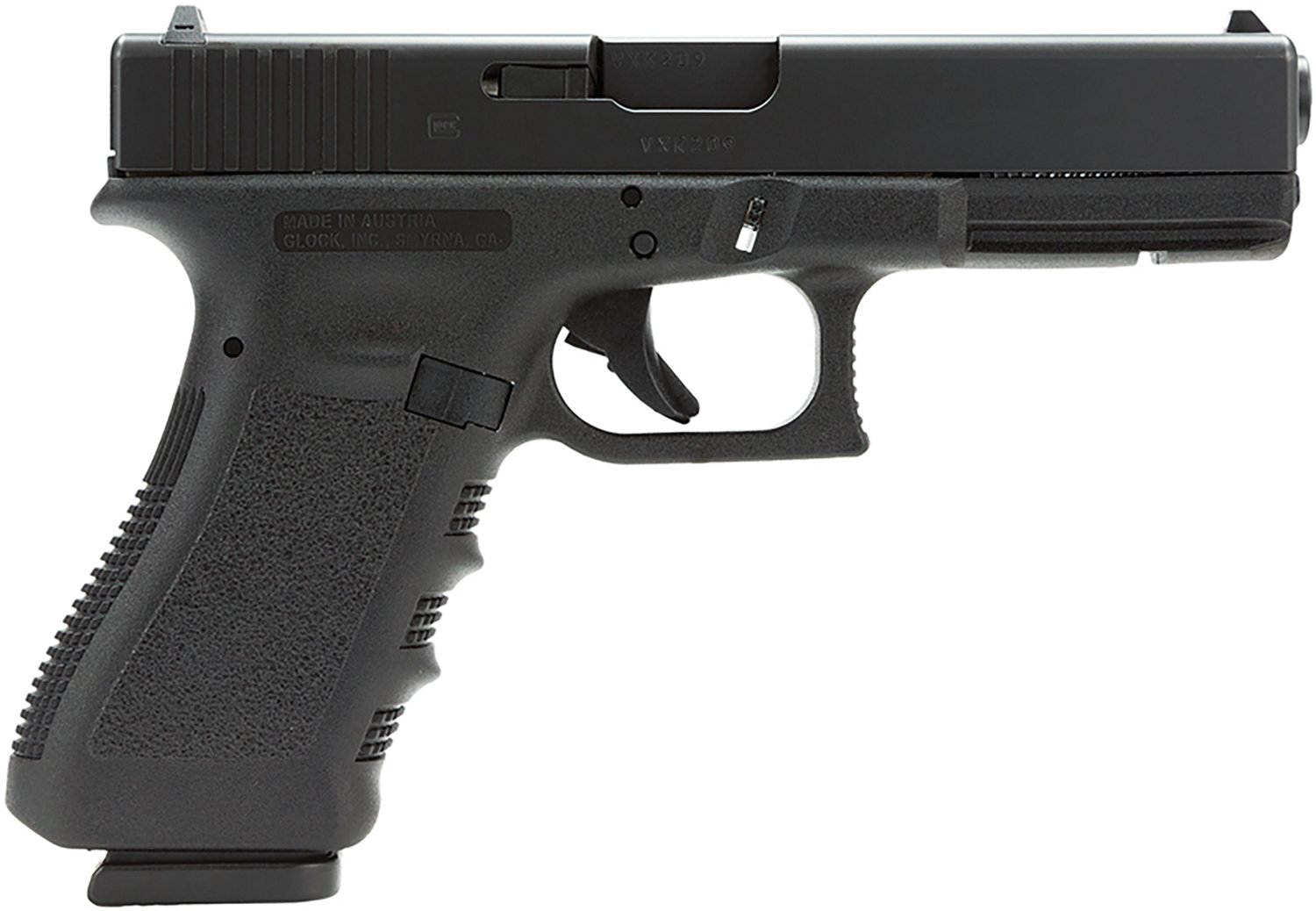 The GLOCK 17V 9mm Full-Size 10-Round Pistol is a component of the New V Series Launch, which introduces the next generation of features, delivering on performance and value. It boasts a magazine capacity of 10 rounds, features striker-fired action, and utilizes a multi-point internal safety mechanism. Crafted with a durable polymer frame, this full-size pistol offers ambidextrous slide stop levers for versatile handling. The tough nDLC finish protects the 4.49-inch barrel and slide, ensuring durability across environments. Front slide serrations and a flared magazine well aid in rapid manipulation and reloading with the GLOCK 17V 9mm Full-Size 10-Round Pistol.