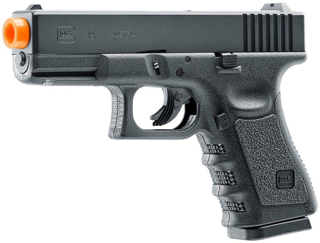 The GLOCK 19 Gen 3 6mm Airsoft Pistol has a fixed slide design with safety and fixed sights. It features a double action trigger and a CO2 method of propulsion. This pistol is compatible with 6mm airsoft BBs. 11-round capacity.