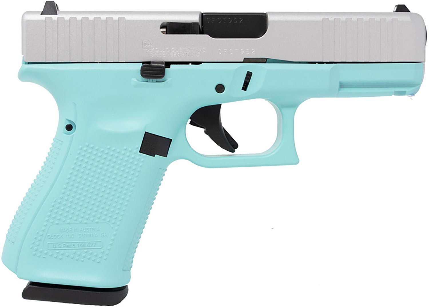 Polymer frame with a Robin's egg blue Cerakote finish and a satin aluminum Cerakote slide finish