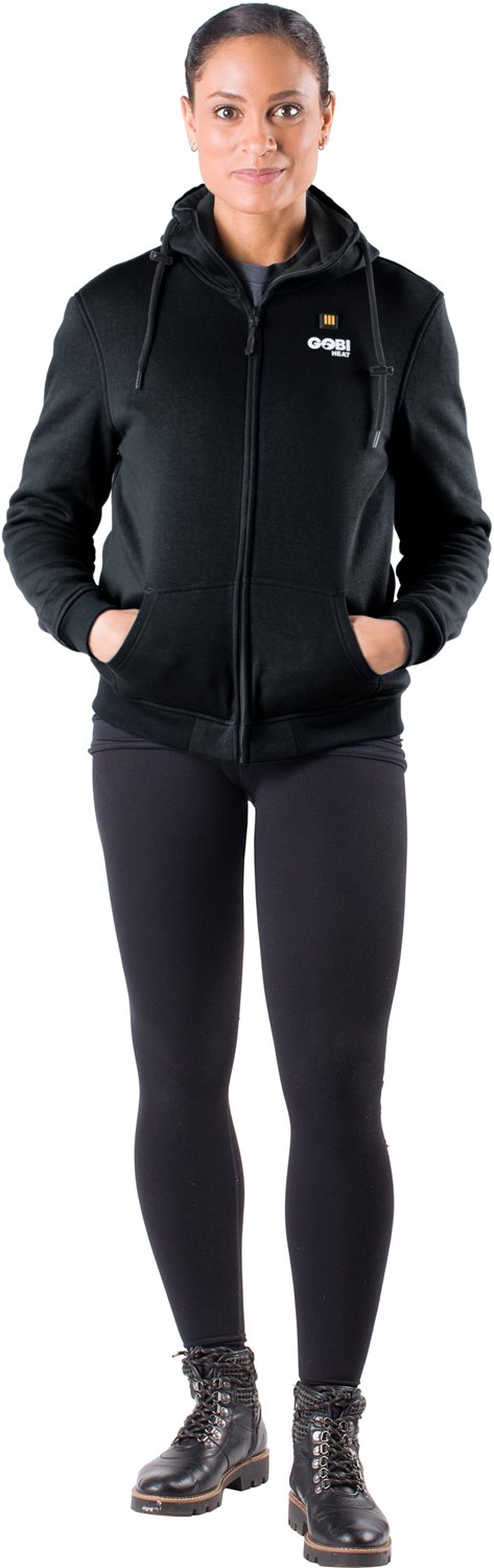 Stay warm and cozy while looking stylish with the Gobi Heat Women's Ridge Heated Hoodie. The cotton and polyester material provides a comfortable feel, while polar fleece lining offers warmth. Wind and water resistance helps keep you dry, and conductive thread heating technology delivers heat to 2 zones in the front and 1 zone in the back.
