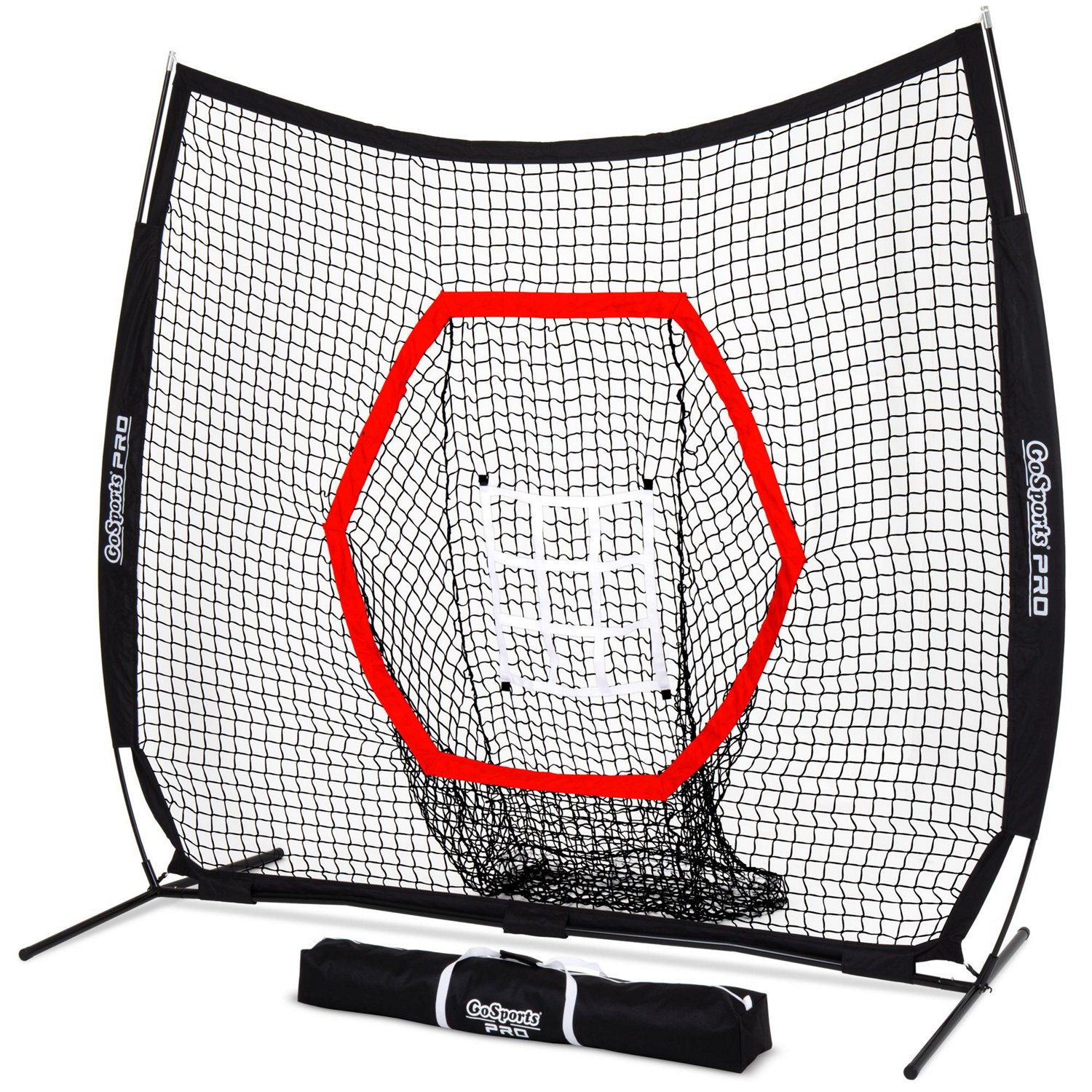 Develop hitting and pitching skills with the GoSports Pro 7 ft x 7 ft Hitting/Pitching Net. The strong netting can withstand high speed hits and pitches, while the strike zone target helps pitchers develop command on the mound. The hex-shaped pocket easily collects balls during practice, and the metal stakes keep the net stable.