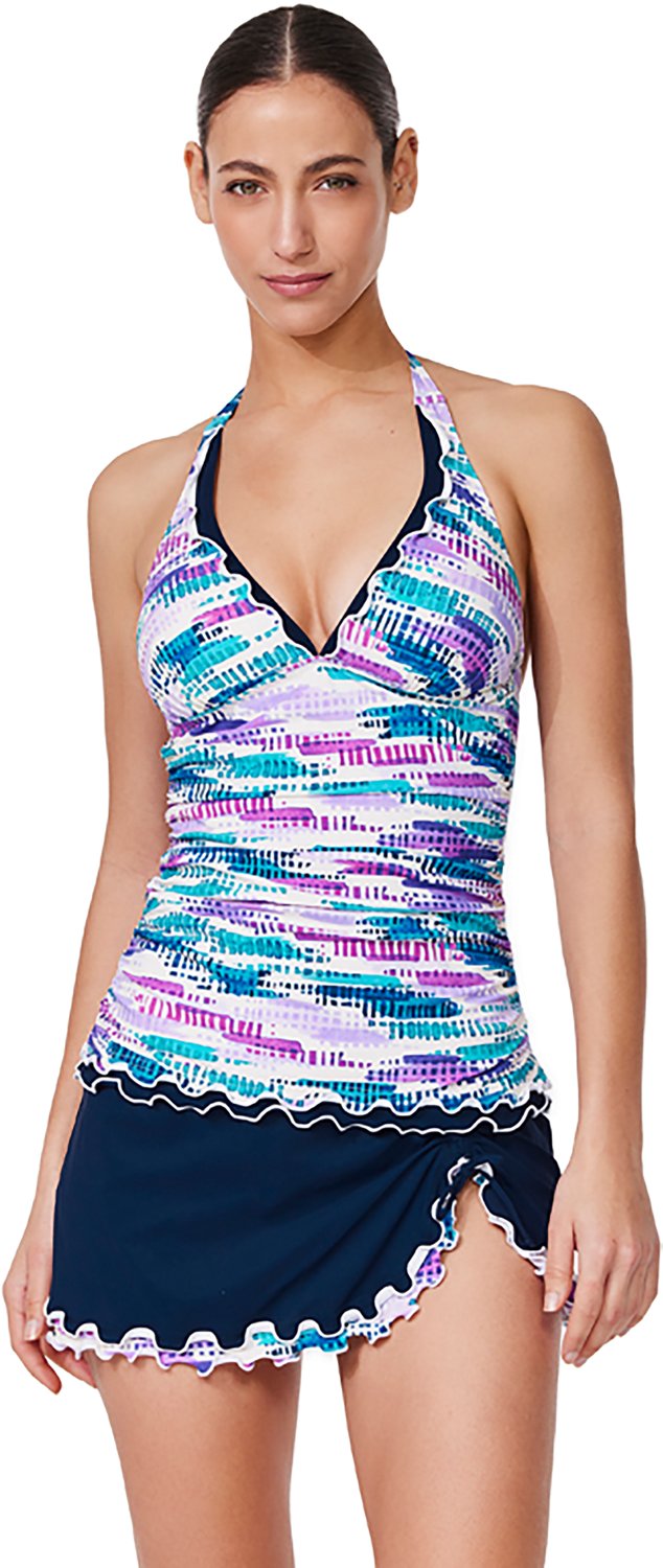 Splash around in the Gottex Women's Canva Tricolore Halter Tankini Swim Top. It is made of 73% recycled polyamide and 27% elastane. The front lining adds a smooth touch, and its built-in soft cups offer support. The adjustable halter tie creates a custom fit.