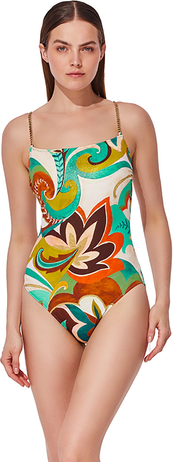 Go for a swim with the Gottex Women's Porto Round Neck Chain Straps 1-Piece Swimsuit. The nylon and lycra fabric provides a comfortable feel, while the adjustable chain straps offer a custom fit. The allover print delivers a stylish touch.