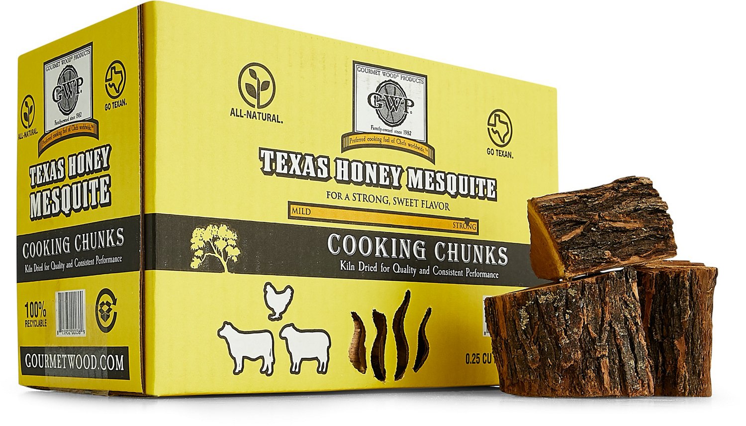 Spice up your dinner with the Gourmet Wood Texas Honey Mesquite Cooking Chunks. The Texas honey mesquite wood works great with red meat, duck, lamb and poultry to add a tasteful smoke, and the chunks also provide a subtle, twangy taste that still allows you to taste your meats' natural flavors. These chips can be cooked at high or low temperatures, meaning you can use them to smoke or as fuel for direct cooking.