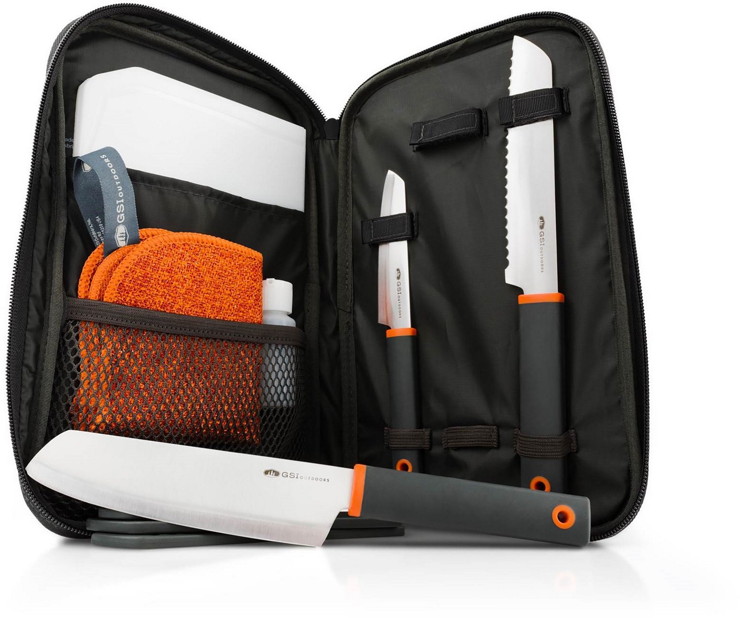 Includes 4 in. paring knife with sheath, 6 in. santoku chef's knife with sheath, 6 in. serrated bread knife with sheath, folding cutting board, soap bottle, dish cloth and ballistic nylon case