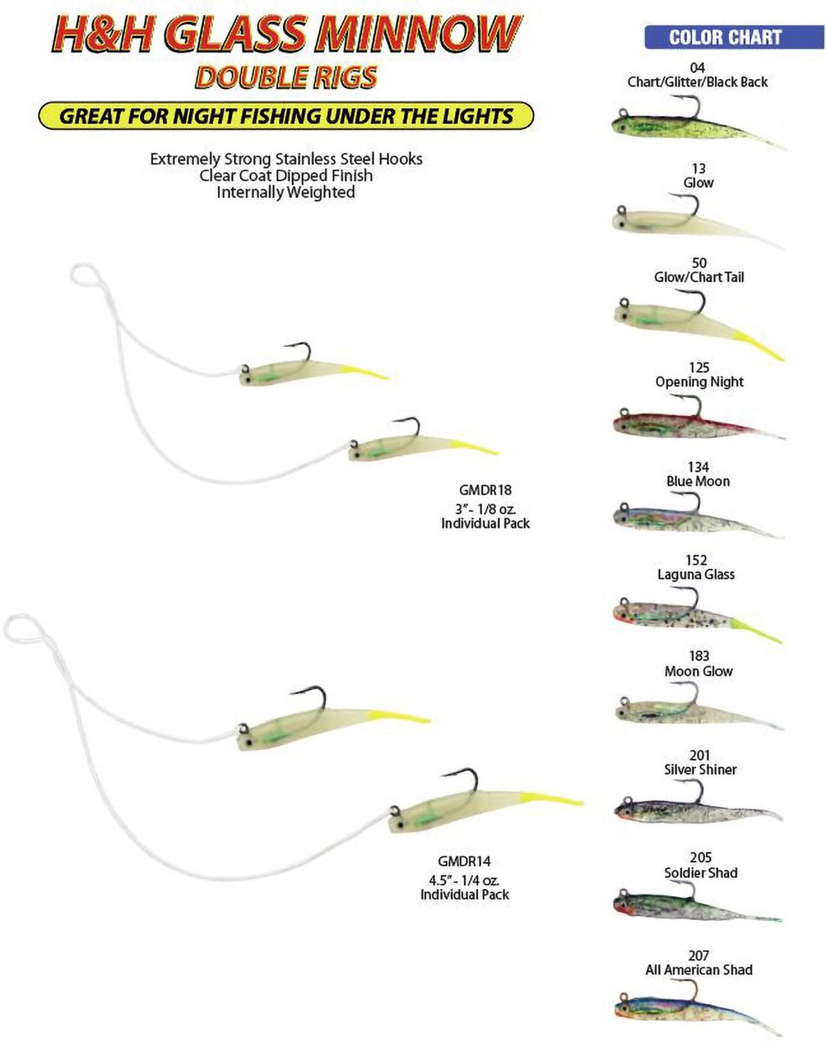 There's no need to quit as dusk begins to creep over a successful day on the water. Now, you can keep angling into the night with the H&H Lure™ Glass Minnow Double Rig. Brightly-colored minnow lures with true-to-life presentation and realistic swimming action attract hungry fish, whether by day or after dark.