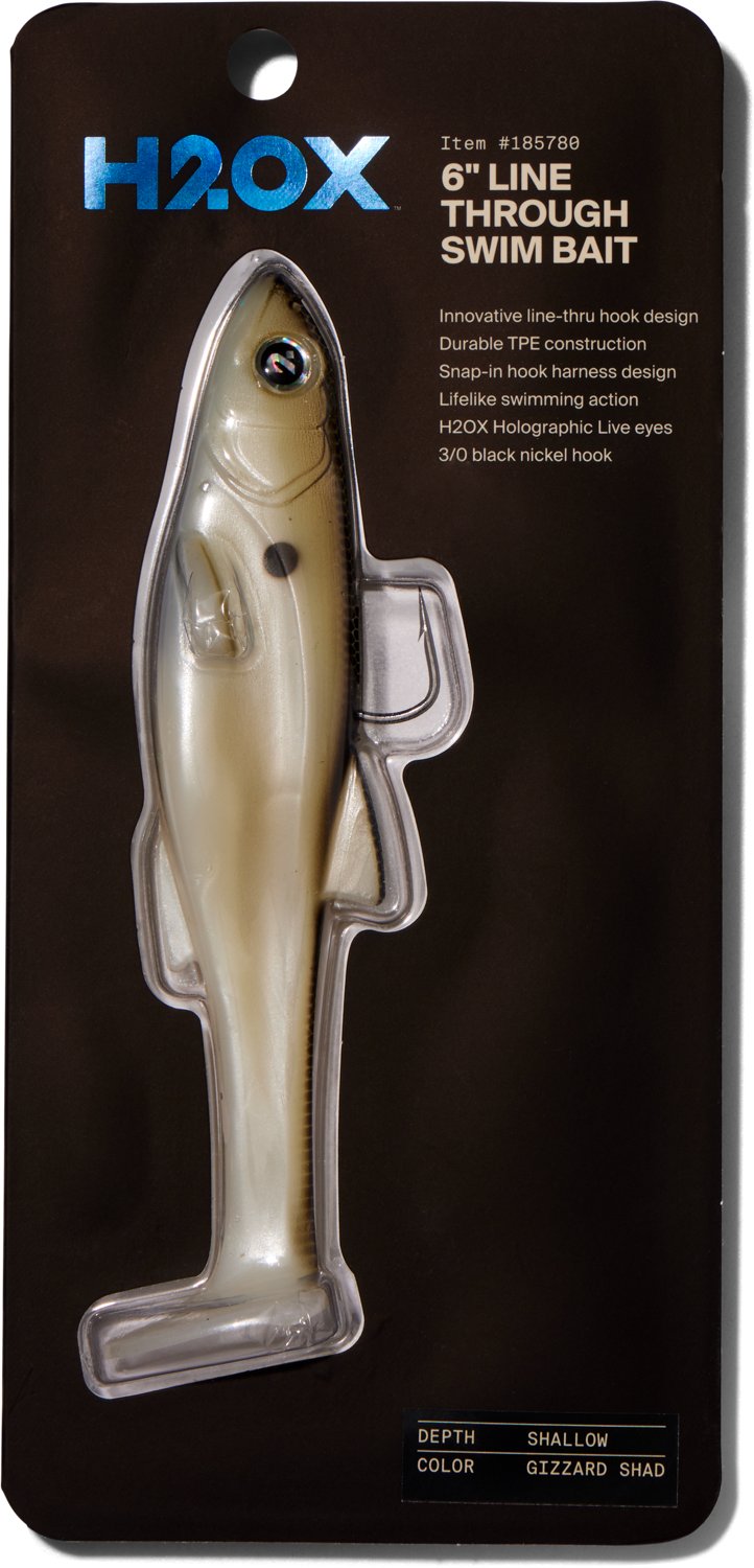Fish in open water with minimal vegetation or structure with the H20X Line Through 6 in Shallow Swimbait. The TPE construction affords durability, while enhanced swimming action mimics baitfish movement. The 3/0 black nickel hook travels away during a bite, helping improve hook-up ratios.