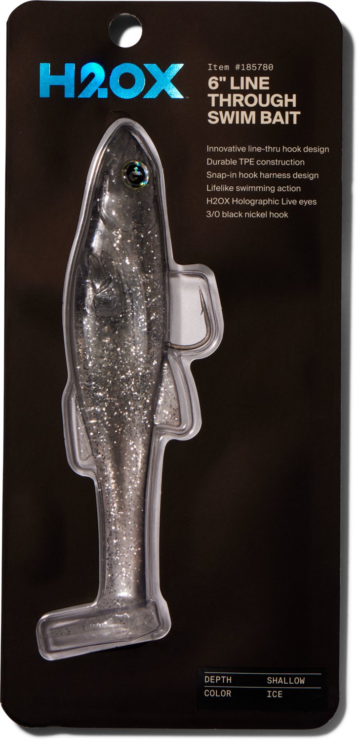 Fish in open water with minimal vegetation or structure with the H20X Line Through 6 in Shallow Swimbait. The TPE construction affords durability, while enhanced swimming action mimics baitfish movement. The 3/0 black nickel hook travels away during a bite, helping improve hook-up ratios.