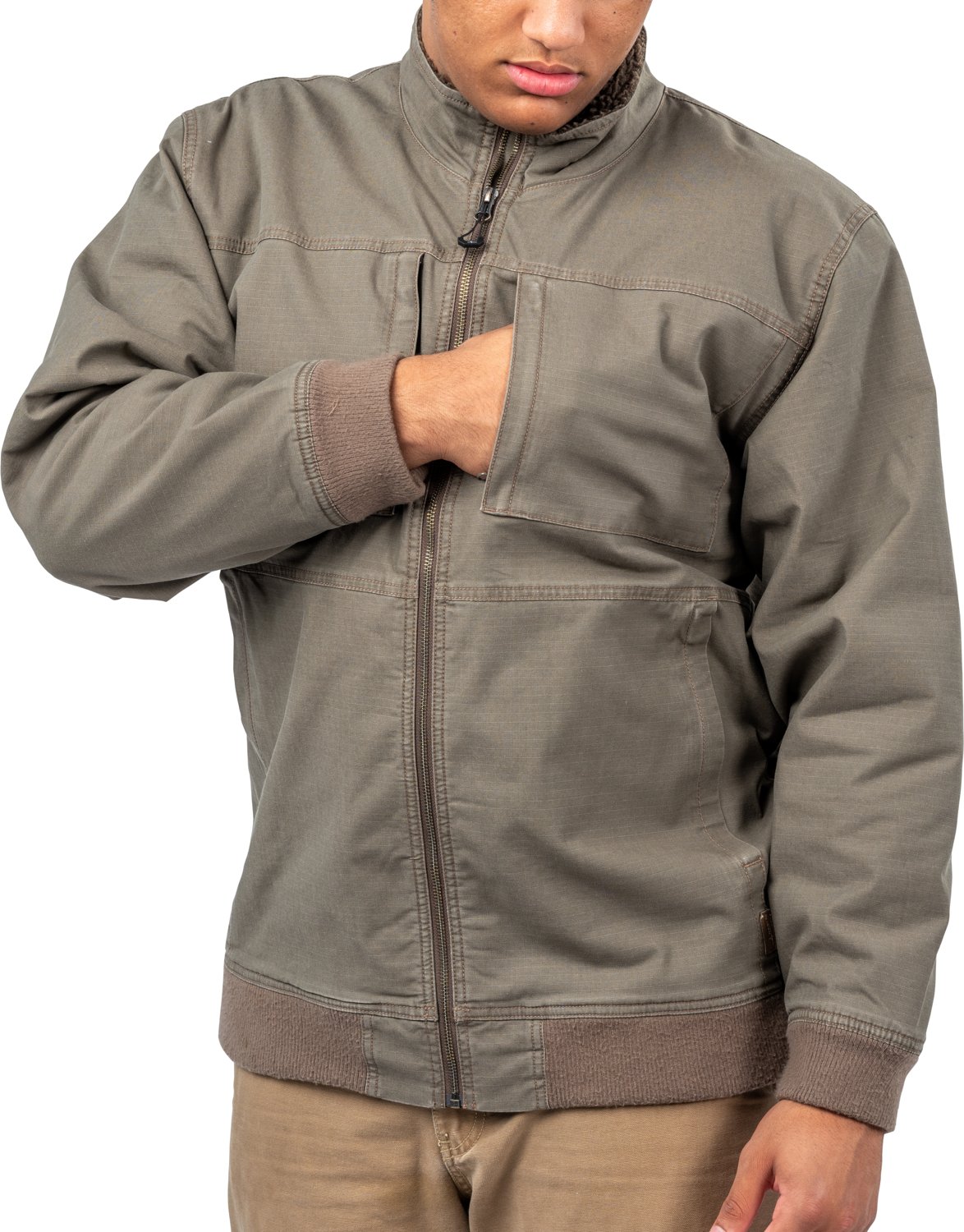 Stylishly stay warm with the Habit Men's Sherpa Lined Canvas Jacket. This durable and rugged jacket is made of cotton, polyester and spandex for durability and stretch, while the polyester insulation and Sherpa liner provide soft warmth. Ribbed hems offer an additional layer of protection from the cold by creating a tight-fitting style.