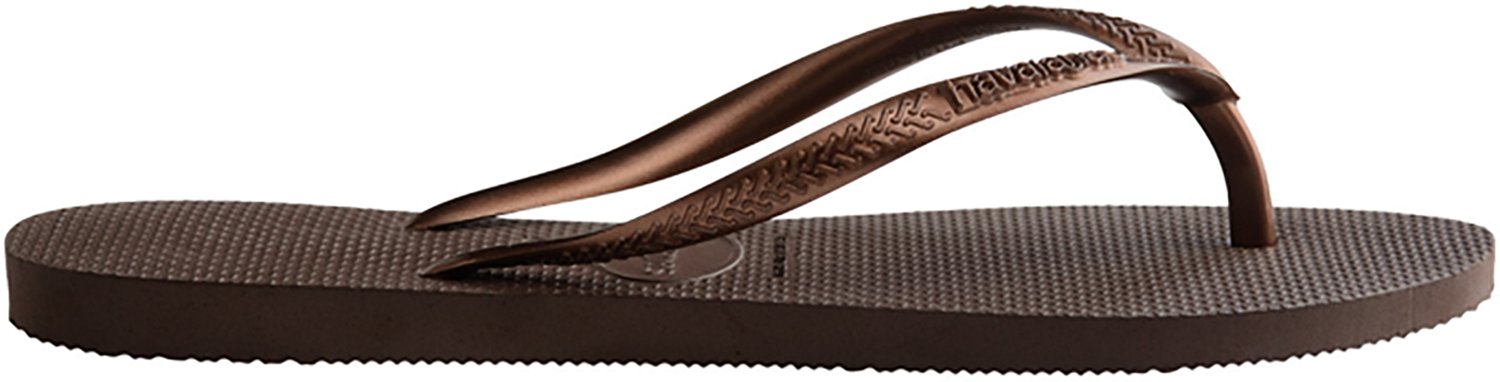 Let your style show from your head to your toes when you wear the Havaianas Women's Slim Flip Flops during your next warm-weather get-together. The flip flops are made with manmade uppers and thin, metallic straps that help highlight your fashion sense, and the nonslip rubber soles are great for near the water.
