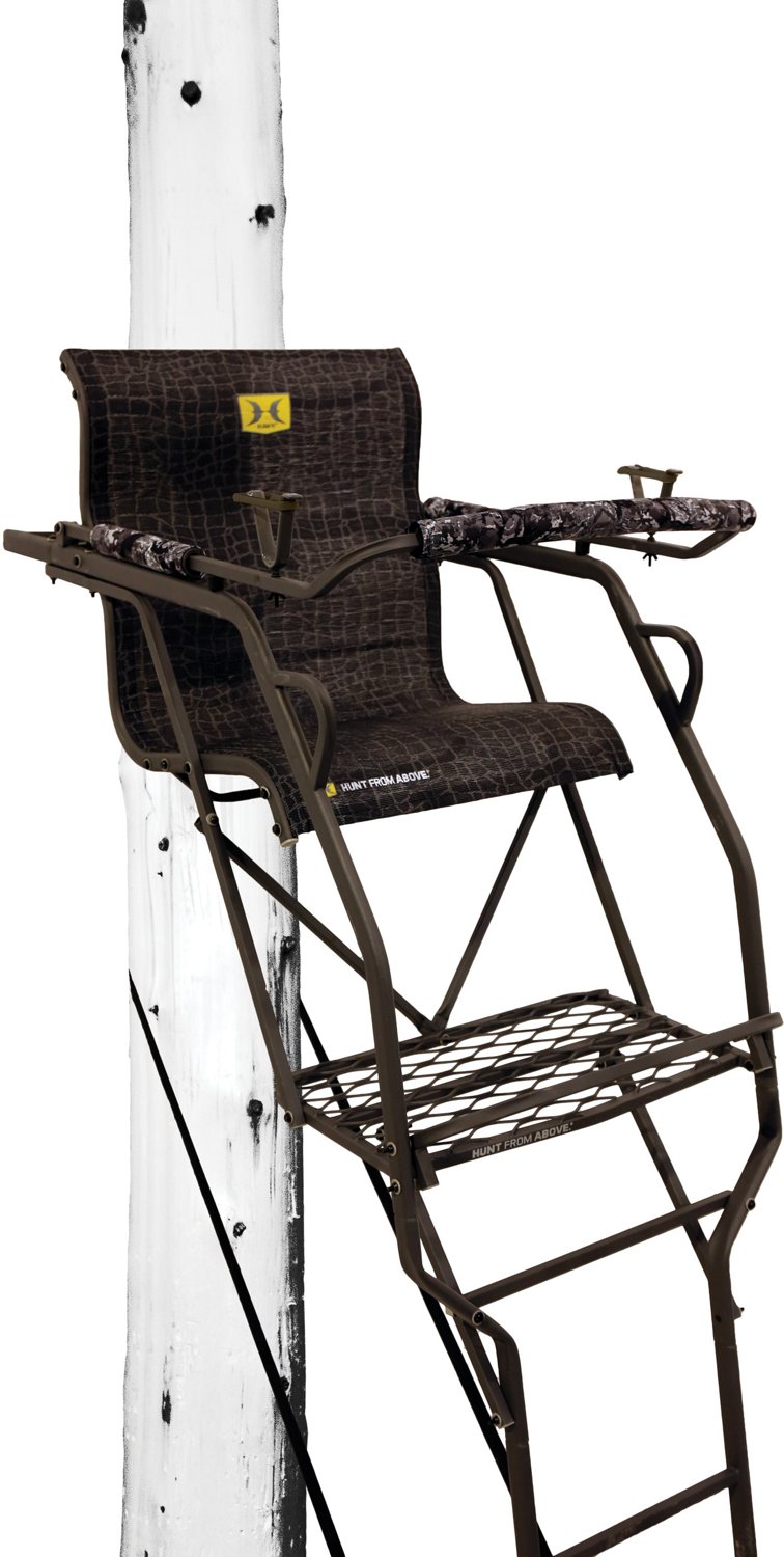 Hunt up in the trees with the Hawk 20 ft Big Denali 1.5 Man SLS Ladder Stand. Using SLS™ technology, the ladder is easier to move and set up. It's built from heavy-duty tubing that can withstand harsh weather and features a MeshComfort™ lounger chair with contoured backrest. A wide foot base and adjustable shooting rail help you get into the right position.