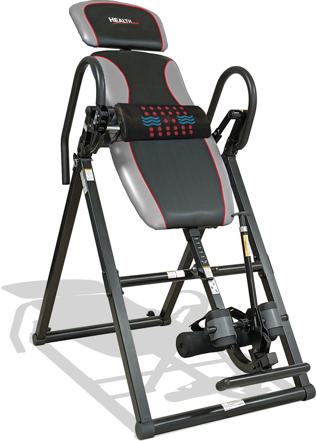 Relieve pain with the Health Gear Heat Massage Inversion Table. The foam and vinyl material provides comfort, while the removable heat and massage pad offers targeted relief. The locking systems ensure safe usage, and the hook-and-loop safety straps keep you locked in place.