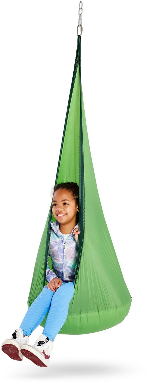 The HearthSong HugglePod Lite Nylon Hanging Chair is the perfect place for kids to snuggle, read, take a nap or have some time away from the world. The nylon fabric and water-resistant design keep the chair strong in the elements, and the inflatable cushion provides a comfortable place to sit. The chair can be hung from a tree or a stand by the reinforced hanging strap.