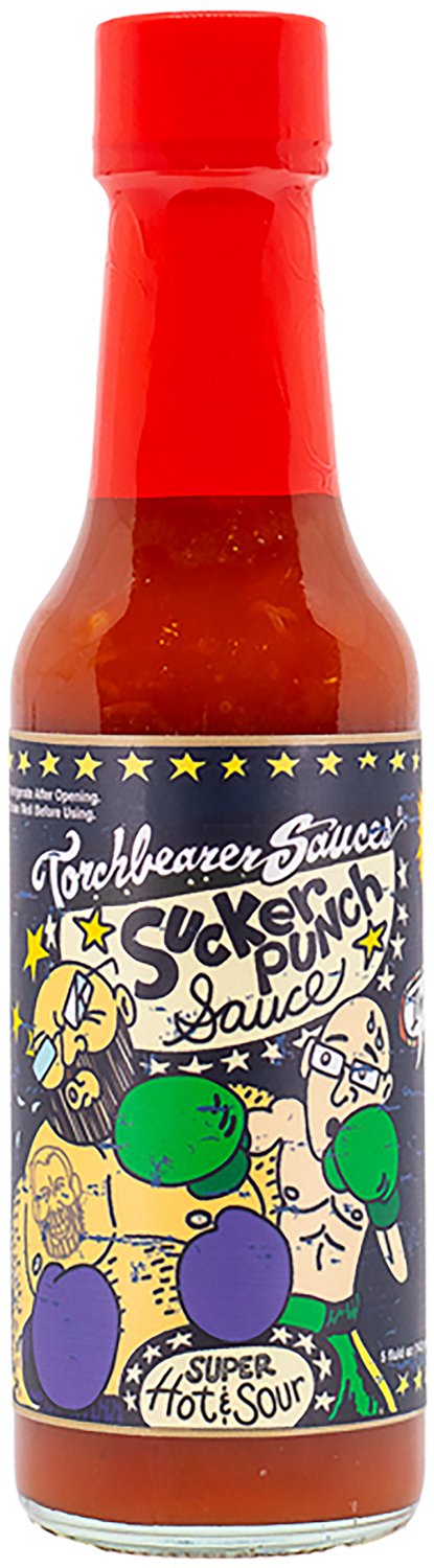 Put your palate to the test with the Heatonist Hot Ones Torchbearer Suckerpunch 5 oz Sauce. Carolina Reaper, ghost pepper, and dragon's breath pepper powder come together to pack in heat, and citrus and minced onion help to level off the sauce's intensity. Developed in Pennsylvania, Torchbearer sauces have a reputation for being distinctly flavorful.