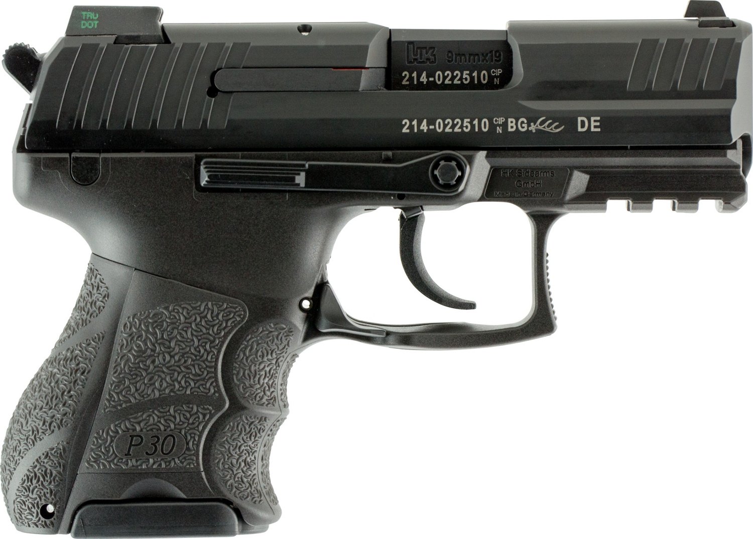 The Heckler & Koch P30SK MA Compliant 9mm Luger Pistol has ambidextrous safety levers and a double and single action with a 10+1 capacity. It also has a Picatinny rail and a polymer special grip frame.