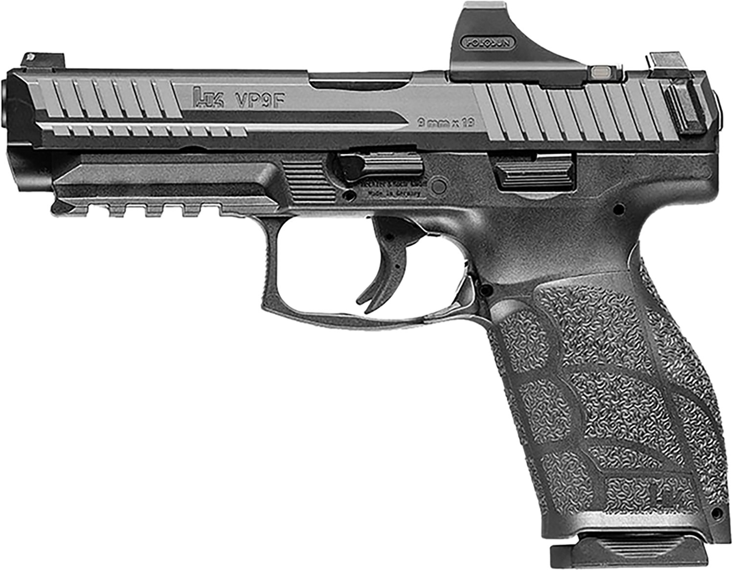 The Heckler & Koch VP9A1 9mm Pistol boasts striker fired action and has a 15+1-round capacity. It's built with a polymer frame, ambidextrous controls and a Holosun SCS optic. Front night and rear black sights and interchangeable grip panels complete the design.