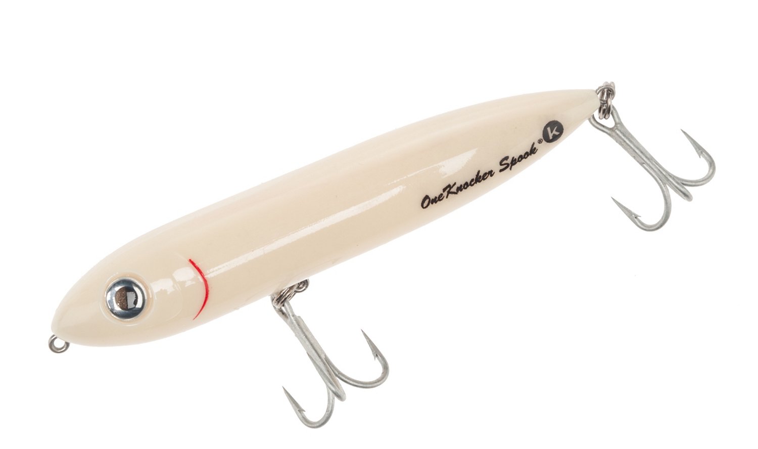 The Heddon One Knocker® Spook® 4-1/2" Topwater Bait produces a loud thumping sound that draws fish from long distances, thanks to the tungsten rattle contained in its sound-intensifying chamber. This topwater bait features two #2 Mustad Triple Grip treble hooks and is great for landing bass, redfish, striper and speckled trout in saltwater. 3/4 oz.