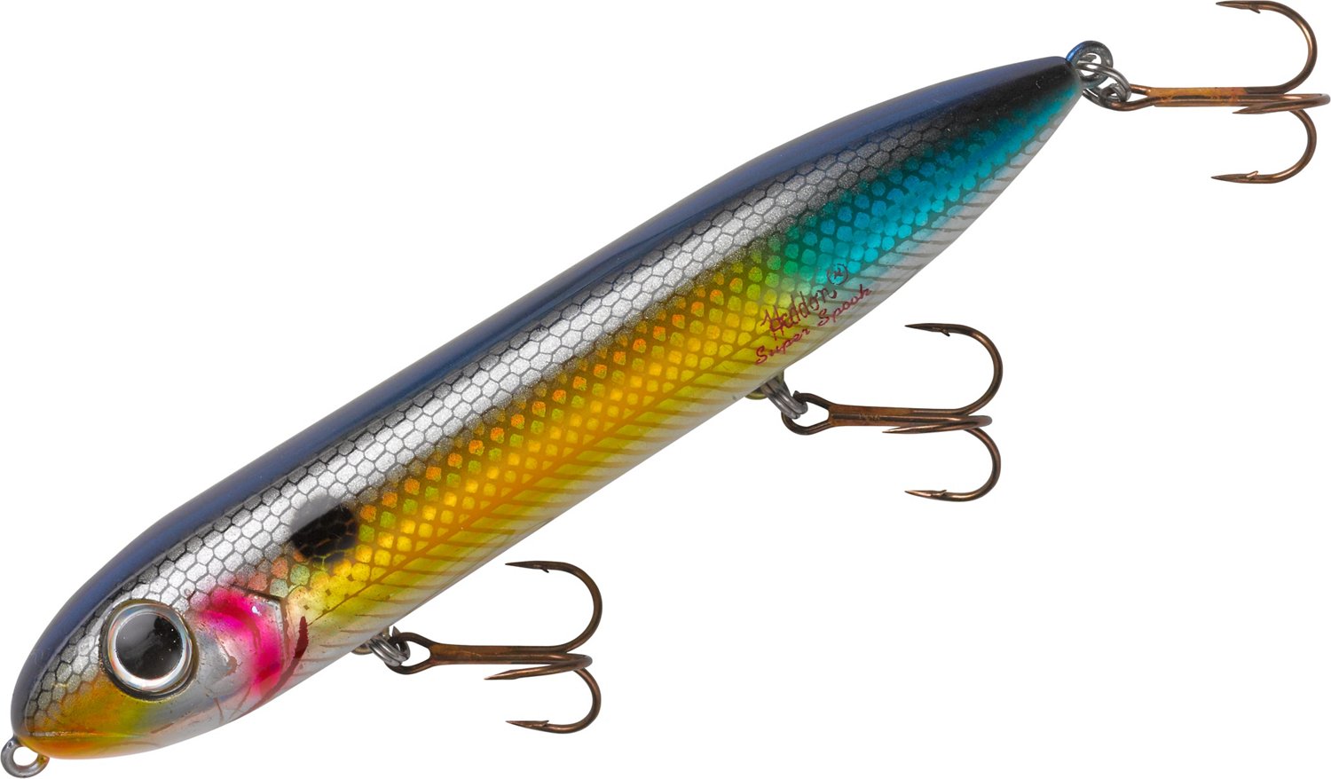 Catch the eye of a trophy fish with help from the Heddon Spook Family Super Spook Topwater Lure. This lure features saltwater-grade treble hooks and is great for taking on giant redfish, gator trout and massive stripers. With a heavy-duty design, this lure stands up to tough, toothy fish and has color patterns that are designed to attract saltwater and freshwater gamefish. 5" long. 7/8 oz.