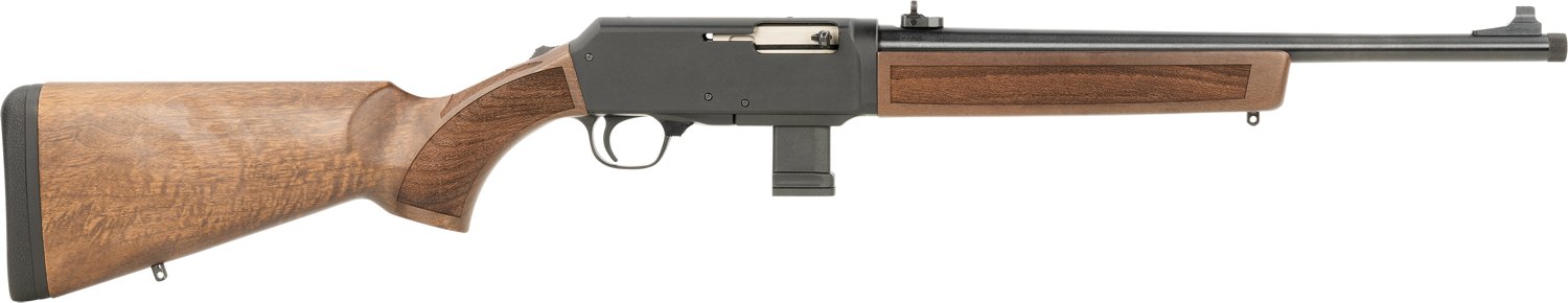 The Henry Homesteader Carbine 9mm Semiautomatic Rifle is built with a threaded barrel and features a 10-round capacity. It has a walnut stock and ghost ring sight, and it's drilled and tapped for an optic rail.