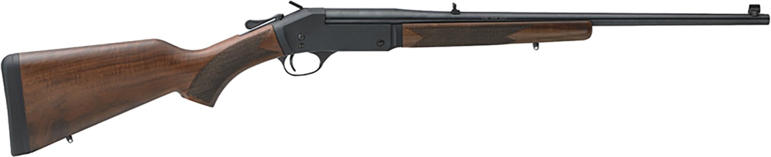 Arm yourself with the Henry Repeating Arms Single Shot .357 Mag Break Action Rifle. It is break action with a single round capacity. The blued round barrel is 22-inches long, and its wood stock is equipped with an American walnut finish. The stainless steel receiver finishes off the design.
