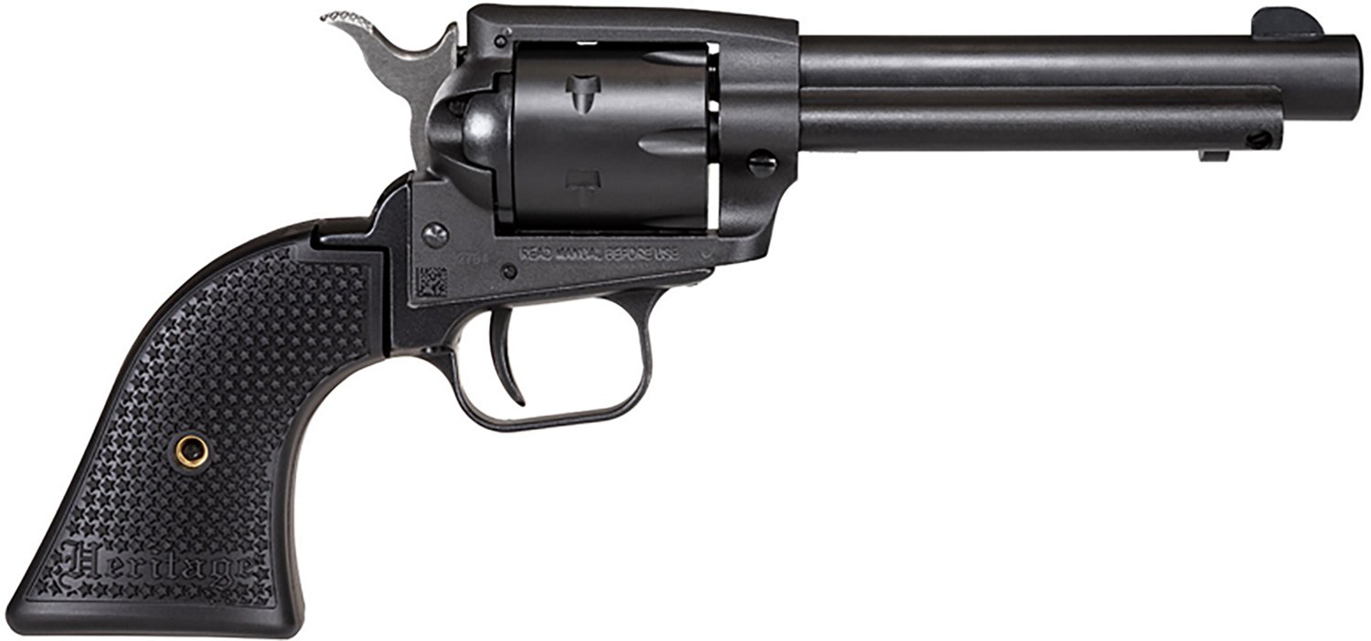 The Heritage Rough Rider .22 LR Revolver is single action and has a 6-round capacity. It's built with a stainless steel barrel, steel frame and a zinc alloy cylinder. Fixed front and notched rear sights, polymer grip and a thumb safety complete the design.