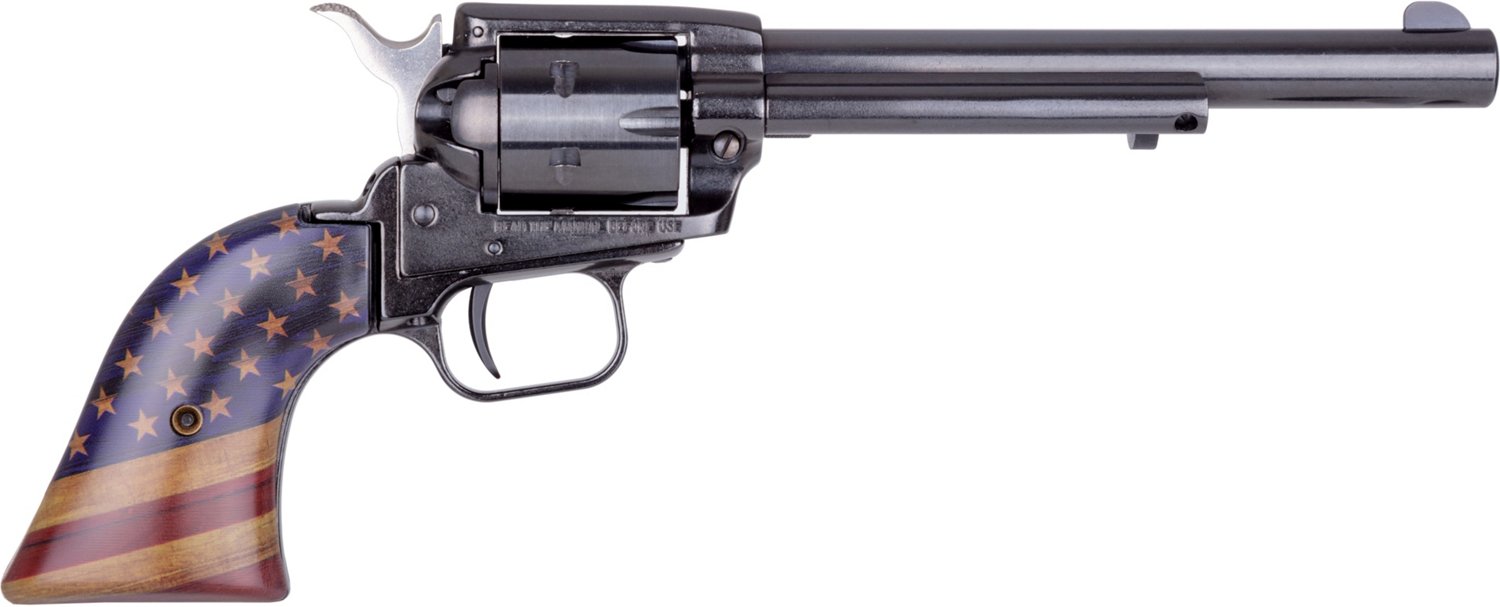 The Heritage Rough Rider Small Bore .22 LR Rimfire Revolver has a 6-round capacity with a blued metal finish and a flag-inspired poly grip. It features single-action firing, a steel ramp front sight and a notched rear sight.