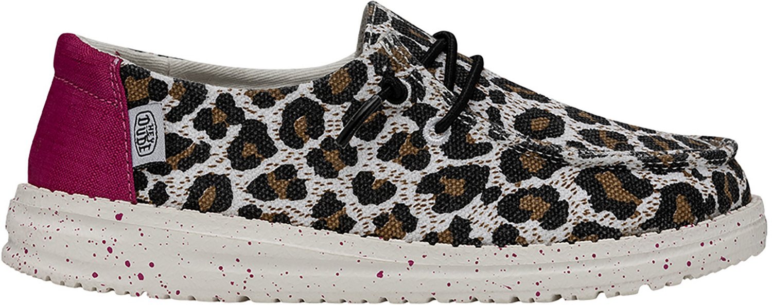 Get kids ready for all of life's adventures with the HEYDUDE Kids' Wendy Cat Cheetah Slip-On Shoes. These iconic moccasins feature breathable cotton canvas uppers with stretch laces for easy slip-on style. Ultralight outsoles won't weigh her down.