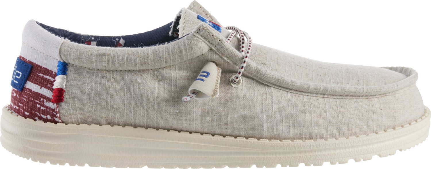 Get ready for all of life's adventures with the HEYDUDE Men's Wally Texas Canvas Slip-On Shoes. These iconic moccasins feature breathable chambray blend uppers with padded collars and elastic laces for easy slip-on style. Ultralight outsoles won't weigh you down.