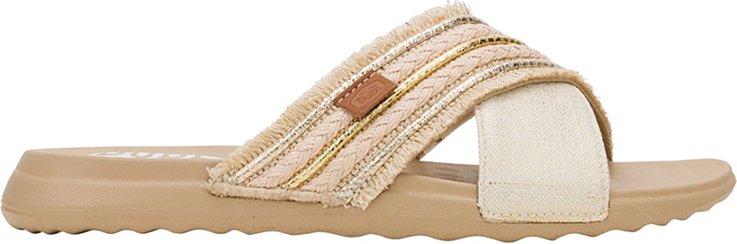 These Hey Dude Women's Christi Slide Novelty Fringe Sandals are a stylish and comfortable option for daily wear. They are made of 80% terylene and 20% cotton for lightweight comfort, and the sandals feature a textured footbed for additional comfort and improved airflow.