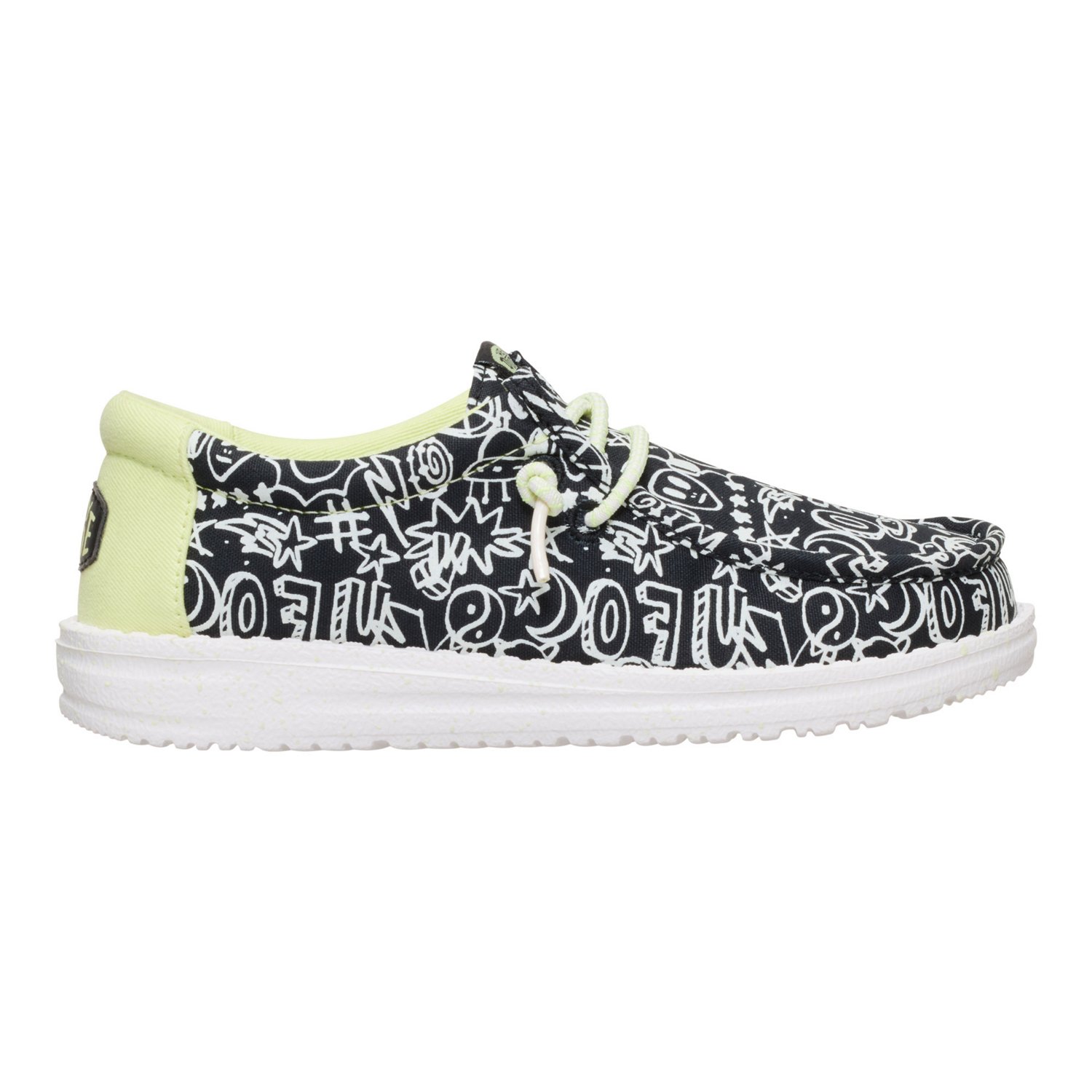 Blast off with the HEYDUDE Boys' Wally Space Glow Shoes. The textile canvas and textile cotton uppers afford durability, while the removable foam insoles provide a comfortable feel. The elastic lace closures offer a secure fit, and the printed graphics deliver a stylish touch.