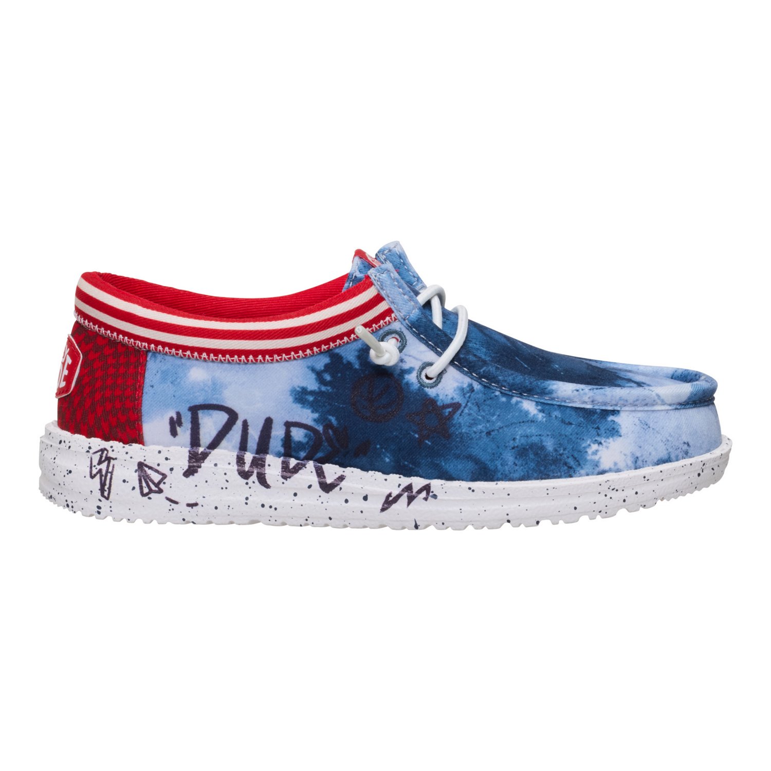 Show off your fun side with the HEYDUDE Boys' Wally Varsity Jacket Shoes. The synthetic textile and textile cotton uppers afford durability, while the removable foam insoles provide a comfortable feel. The elastic lace closures offer a secure fit, and the allover tie-dye print and graffiti-style graphics deliver a stylish touch.