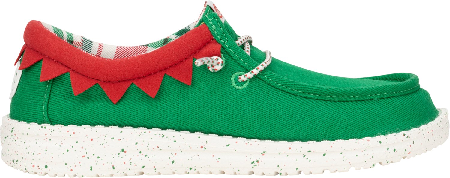 Get them in the holiday spirit with the HEYDUDE Kids' Wally Holiday Elf Shoes. These lightweight shoes feature twill uppers and removable foam insoles for comfortable wear, while the flexible outsoles offer lasting durability. Elastic laces make these shoes easy to slip on and off, while the colorful trim create an elf-like look.