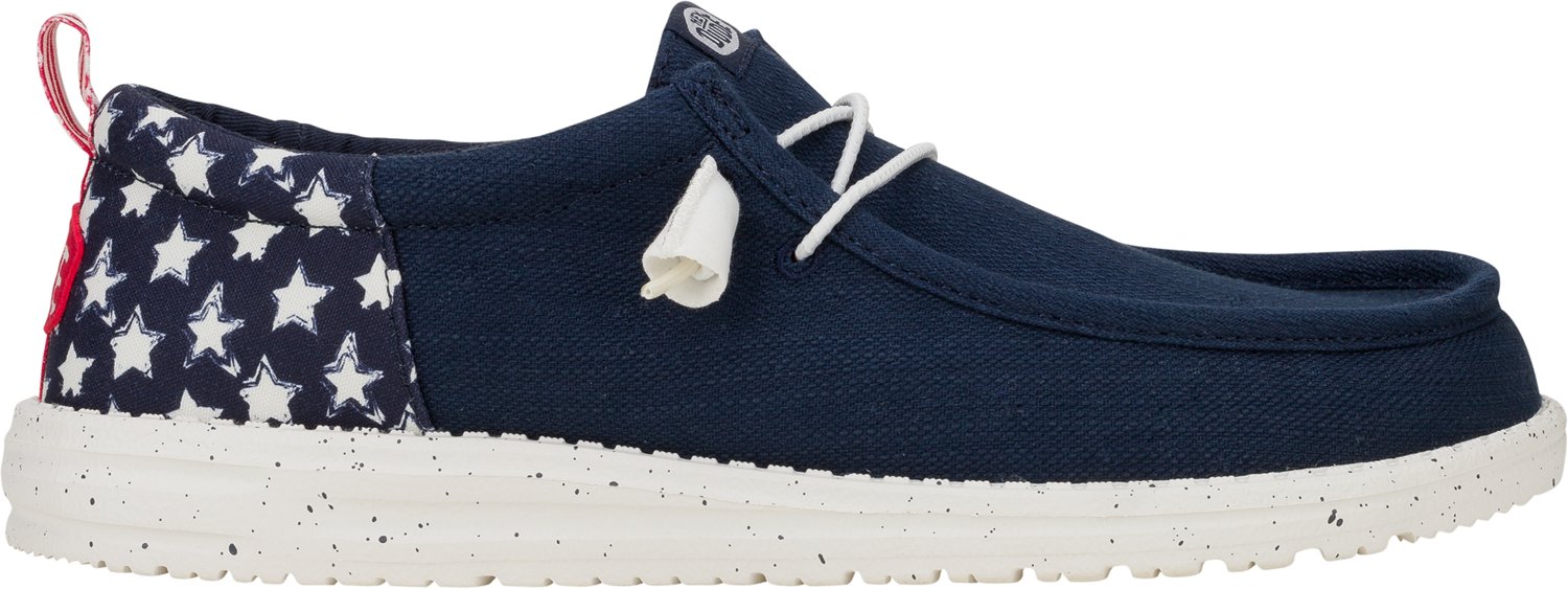 Explore the USA in the HEYDUDE Men's Wally Americana Funk Americana Stars Slip-on Shoes. These stars-and-stripes slip on and off, so you can kick them off in between your travels. Textile uppers and foam insoles offer all-day comfort, while the rubber outsoles help you keep your footing.
