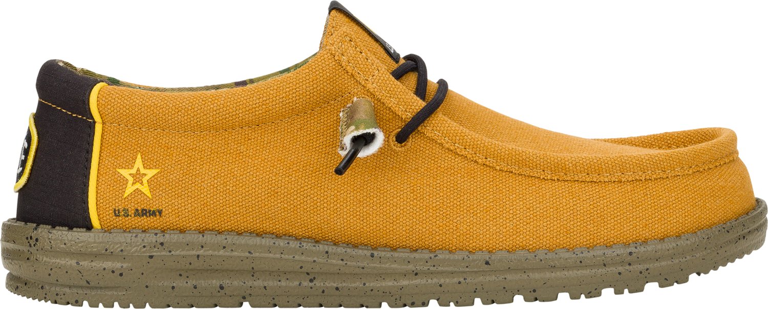 Support the armed forces in the HEYDUDE Men's Wally Energy US Army Slip-on Shoes. Designed for all-day comfort, these lightweight shoes feature breathable canvas uppers and foam insoles for a soft feel and cushioned fit. The elastic laces make it easy to slide these shoes on and off, while the flexible outsoles hold up. The US Army graphics complete these trendy shoes by showing off your love for your country.