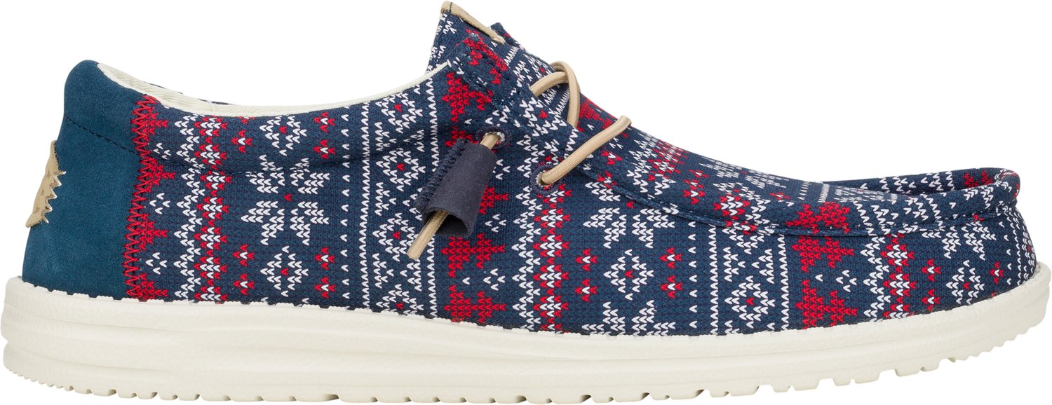 Get cozy in the HEYDUDE Men's Wally Fairisle Sweater Slip-on Shoes. These lightweight shoes have canvas uppers for breathability and flexible outsoles for durability. Removable foam insoles combine with cushioned ankle collars for a comfortable fit you'll enjoy all day. The alpine print creates a warm, sweater-like feel.