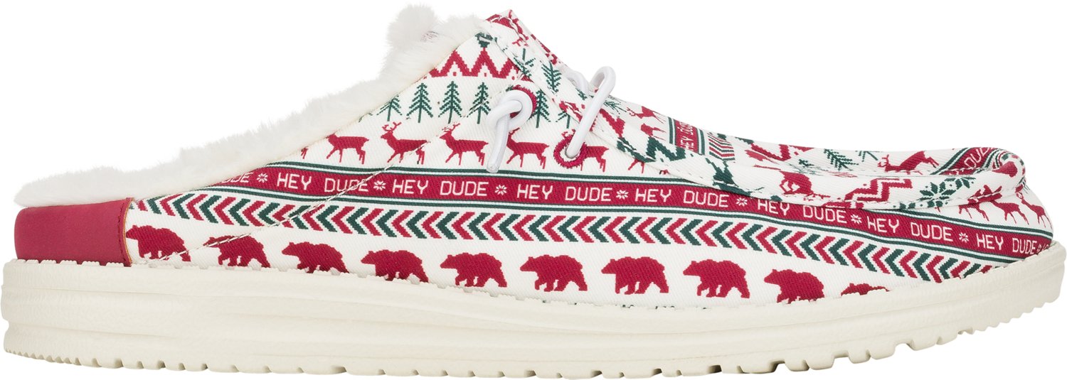 Spread holiday cheer in the HEYDUDE Men's Wally Holiday Print Warmth Slip-on Shoes. These lightweight shoes combine fashionable suede uppers with flexible outsoles for durability. The warm lining, foam insoles and cushioned ankle collar keep your feet nice and toasty all year, while the holiday print puts you in a festive mood.