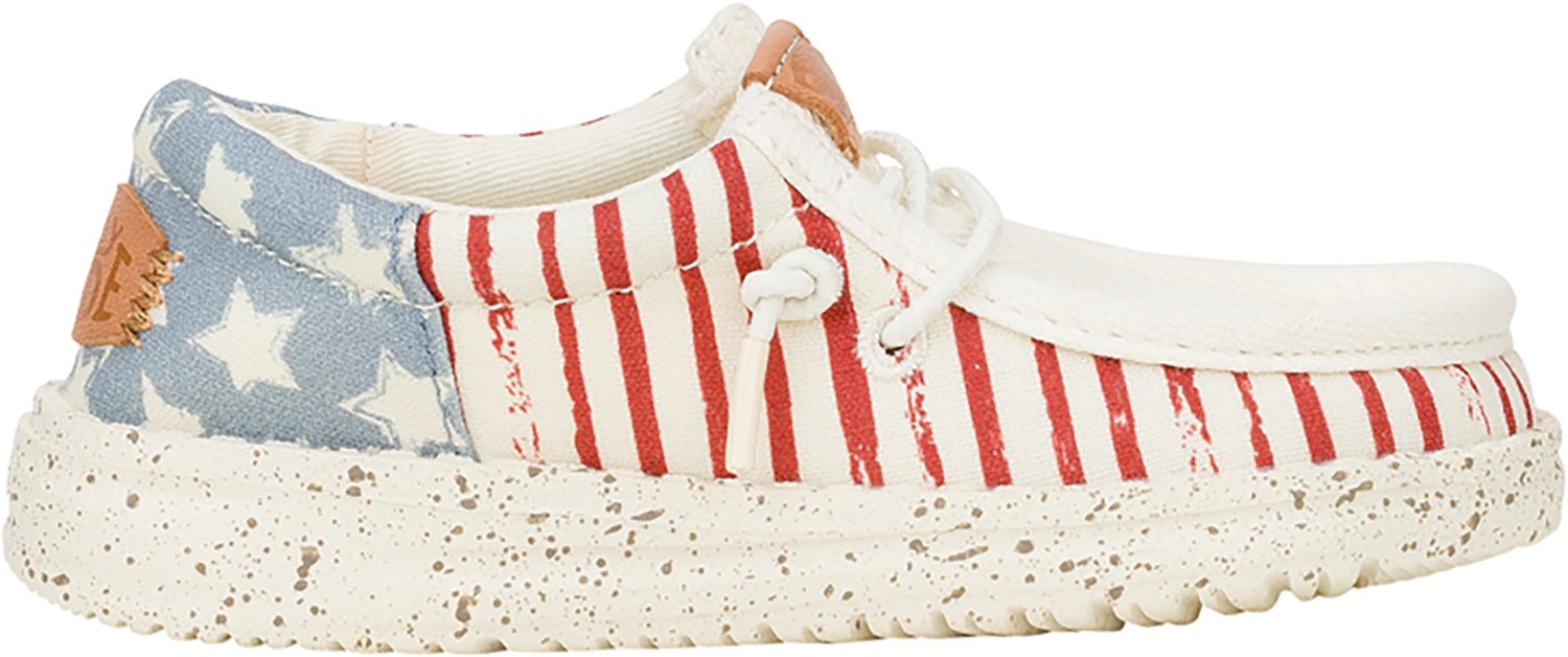 Have your little one stepping with confidence in the HEYDUDE Toddlers' Americana Stars Slip-On Shoes. Their canvas upper improves breathability. The lightweight outsole is flexible, and their foam insole is removable. The elastic laces provide additional detailing.