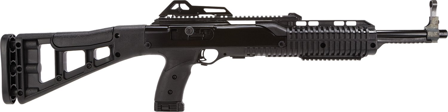 The Hi-Point Firearms Carbine .40 Smith & Wesson Semiautomatic Rifle is crafted with a 17.5-inch barrel, Weaver-style Picatinny rails and a grip-mounted clip release. The rifle is equipped with fully adjustable rear peep and post front sights, as well as a manual thumb safety. Standard trigger. Made in USA.