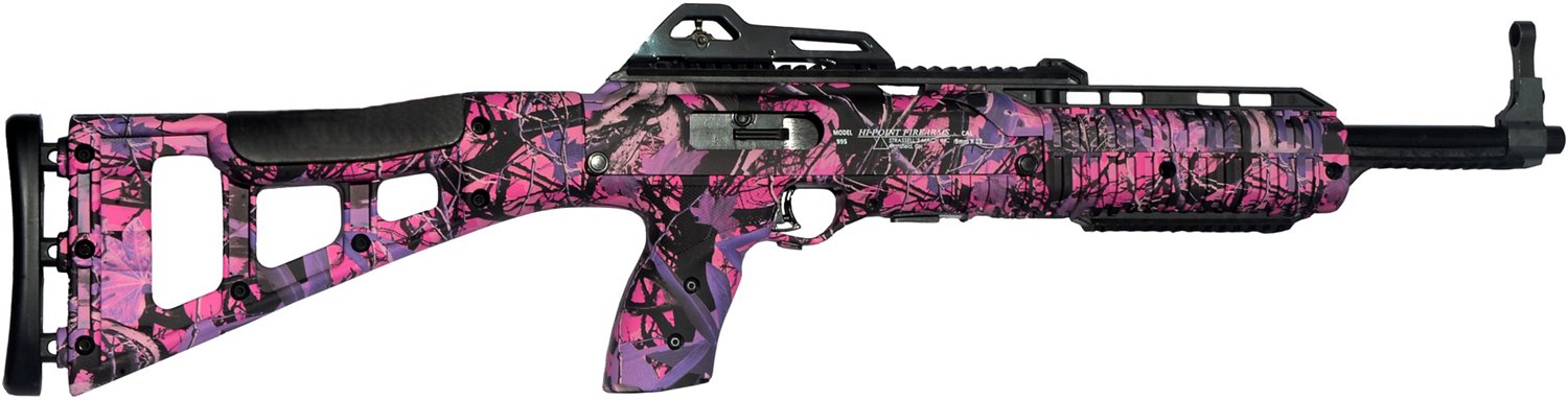 The Hi-Point Firearms Carbine 9mm Semiautomatic Rifle can accept any factory ammunition and is designed with a camo pattern. The barrel measures 16.5 inches, and the rear and front sights are both fully adjustable. Manual on/off thumb safety. Made in USA.