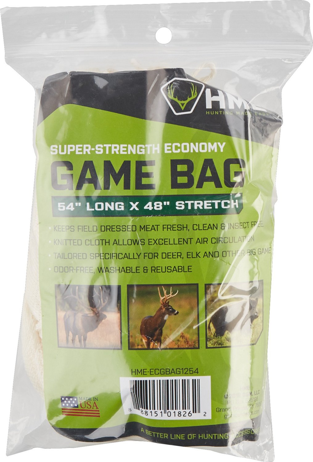 Keep your field-dressed meat fresh, clean and insect-free with the HME Products Single Econ Game Bag. Designed for deer, elk and other big game, this game bag is constructed with knitted cloth to maintain air circulation. It's odor-free and washable, so you can reuse it as needed.