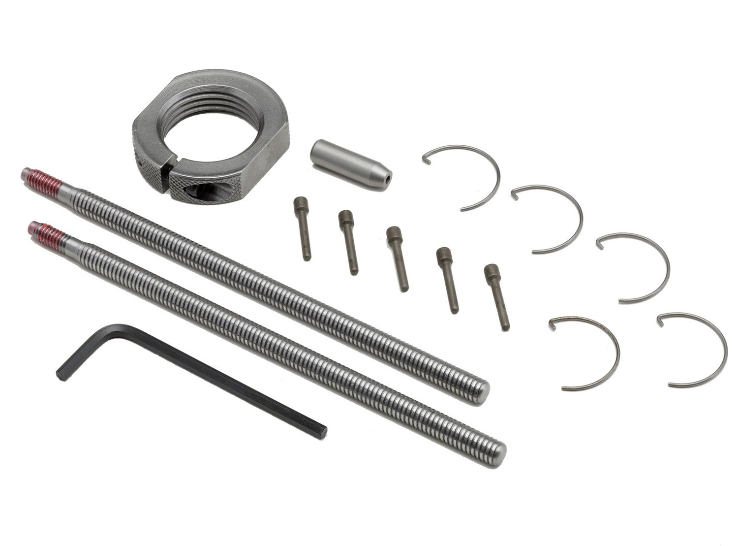 Includes 2 replacement spindle rods, 5 replacement large decapping rims, 1 replacement die lock ring, 5 replacement shell-holder retaining rings and 1 replacement 0.215" diameter expander