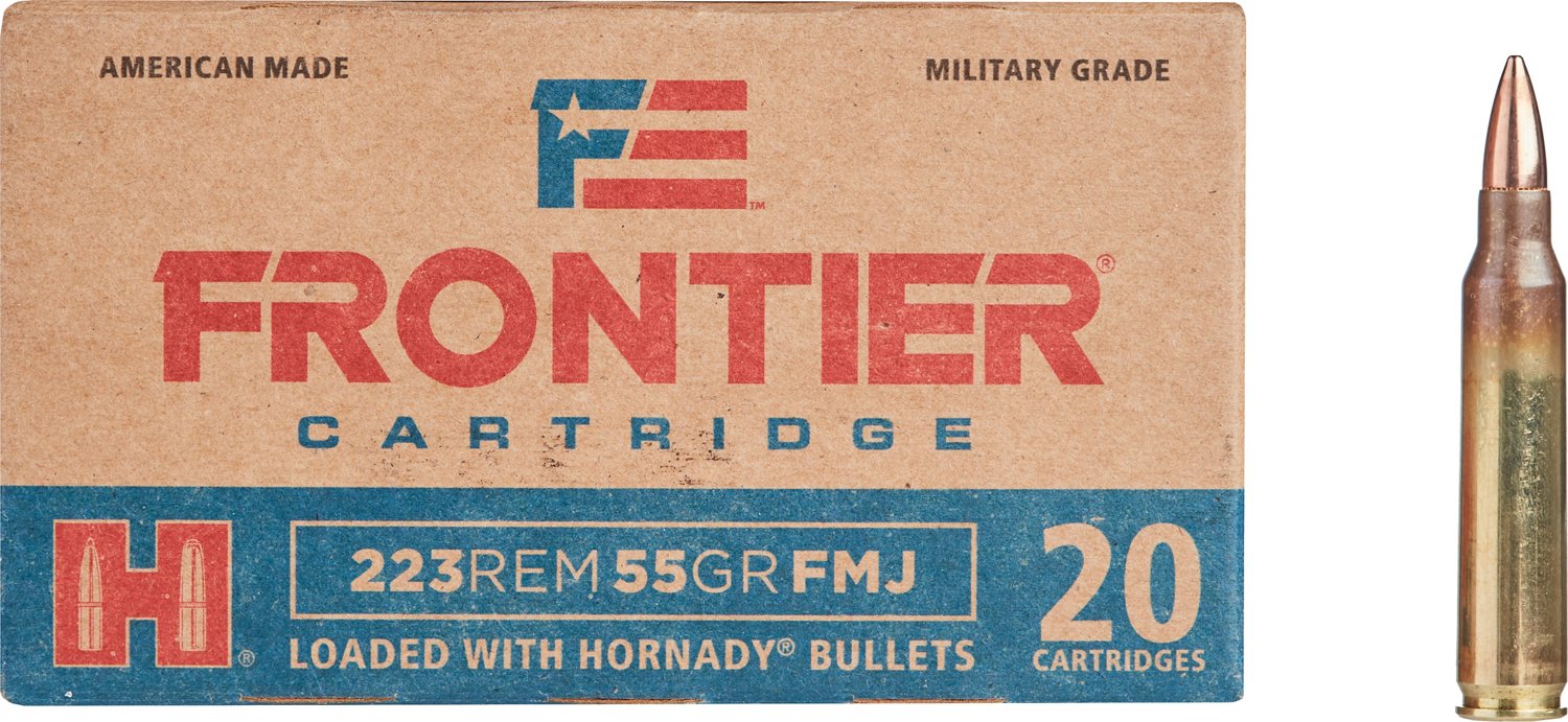 The Hornady Frontier .223 Remington 55-Grain Centerfire Rifle Ammunition includes full metal jacket cartridges in a 20-round box. Made in USA.
